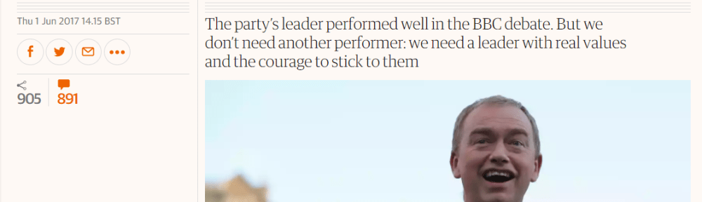 “Hair-shirt, muesli-eating Guardian readers”. That’s what Tim Farron called us. Big words from a man whose party languishes at 8% in the polls. He accused Theresa May of taking her supporters for granted – well sure, but what do you call this? I’m not one to judge a political figure on a one-off television performance. It is, after all, not Britain’s Got Talent. But Farron’s behaviour on the BBC debate is symptomatic of an underlying and quite incurable condition: he’s a career politician. He will say whatever it takes to rescue his party from oblivion.